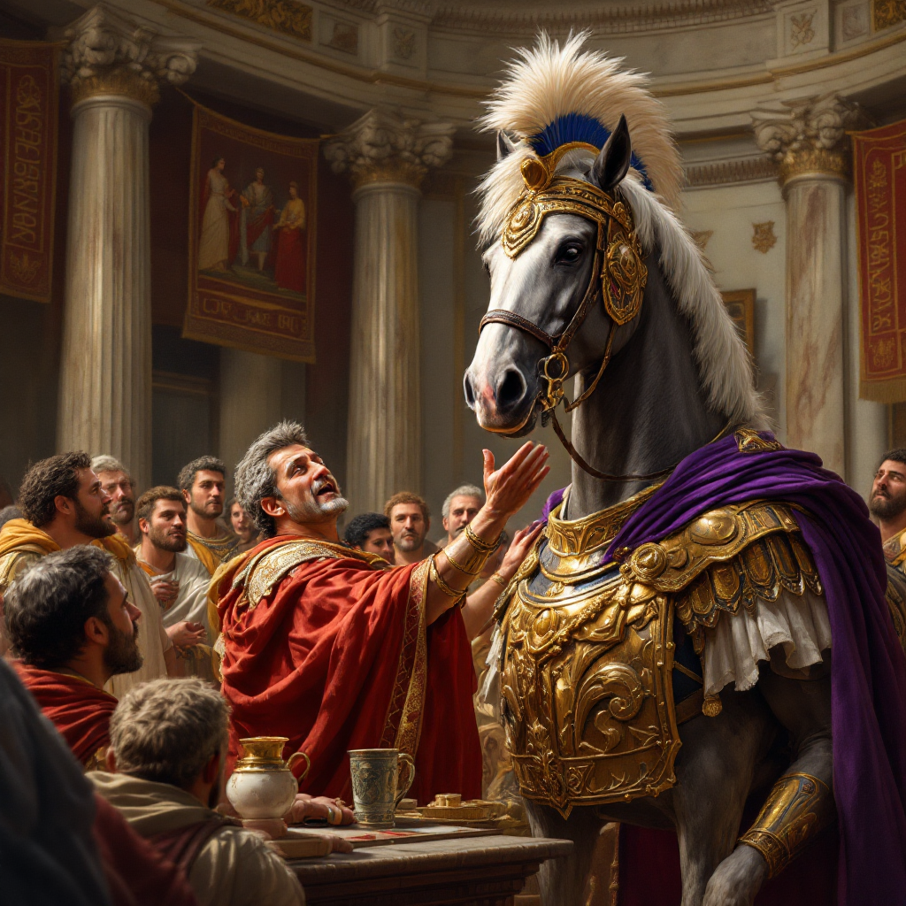 칼리굴라의 가장 유명한 일화 중 하나는 자신의 애마 인키타투스(Incitatus)를 집정관으로 임명하려 했다는 것이에요. 인키타투스는 라틴어로 '빠른' 또는 '격렬한'이라는 뜻인데, 이 말은 칼리굴라가 가장 아꼈던 경주마였답니다. 칼리굴라는 이 말을 위해 대리석으로 만든 마구간을 지어주고, 상아로 만든 구유에서 먹이를 주었으며, 심지어 자주색 담요로 덮어주기까지 했어요. 로마에서 자주색은 황제만이 사용할 수 있는 색깔이었기 때문에, 이는 매우 파격적인 대우였죠.